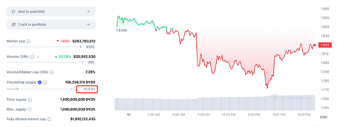 甚至有些 PoS 区块链的质押率高达 50% 以上,众所周知,DYDX 代币目前的流通量仅为 15.63%,后续的解锁释放量还是有些大的。