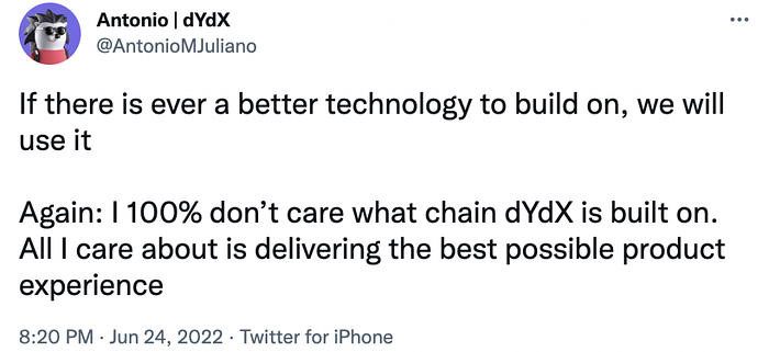 “如果有更好的技术可以构建(dYdX),我们将使用它”、“我 100% 完全不在乎 dYdX 构建在什么链上,我只关心给用户带来最好的产品体验”。