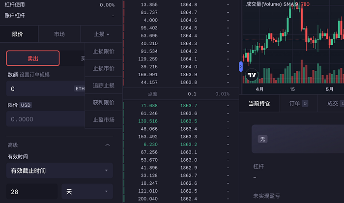 用户在 dYdX 平台不但可以下市价单和限价单,而且还包括了 5 种止损模式,另外,还可以设置订单的有效截止时间。