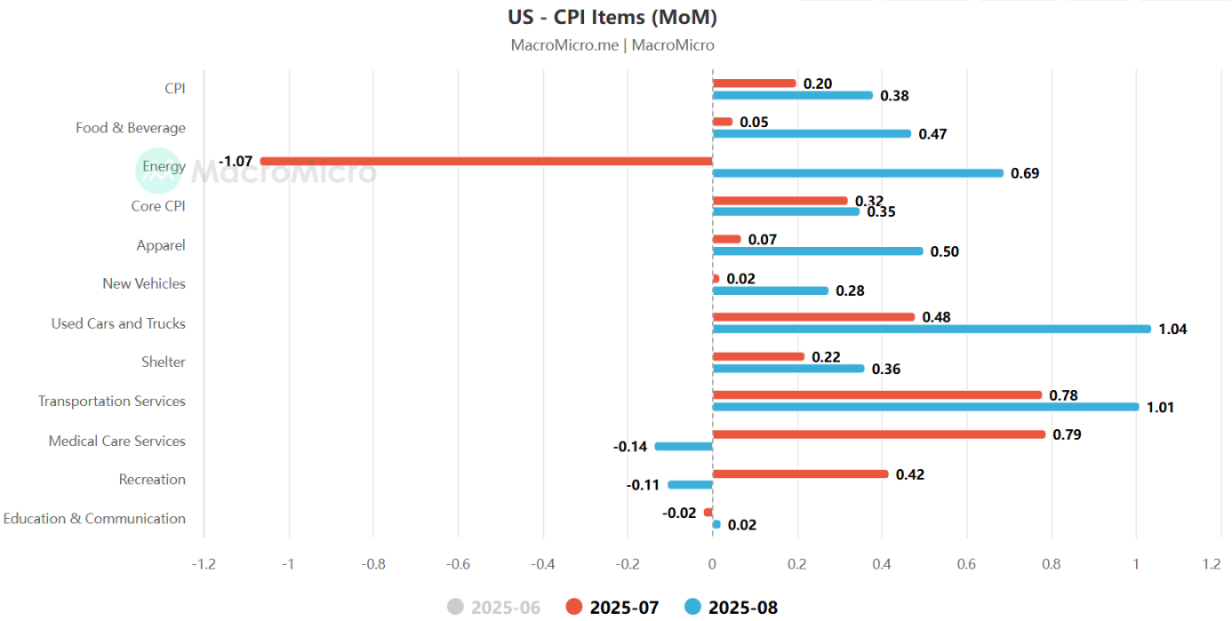 a. 8 月 CPI 同比增长 2.9%,符合预期但高于前值的 2.7%。环比增长 0.4%,高于预期的 0.3% 及前值的 0.2%。美国 8 月核心 CPI 同比 3.1%,环比 0.3%,均持平预期和前值;