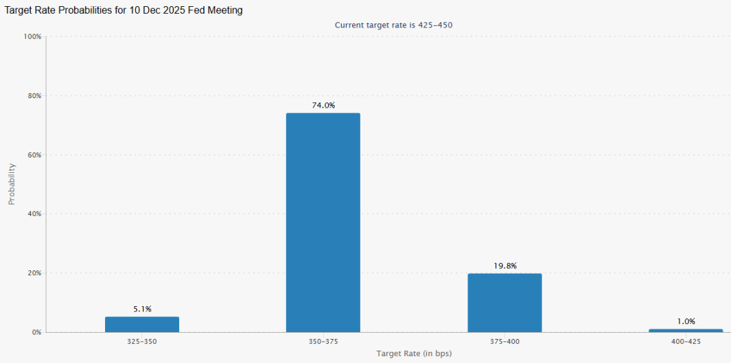 a. 市场对 12 月美联储会议的利率预测明显偏向宽松,近 75% 的市场参与者预计年底利率将在 3.50%–3.75%,即交易员充分消化了美联储年底前降息 3 次;