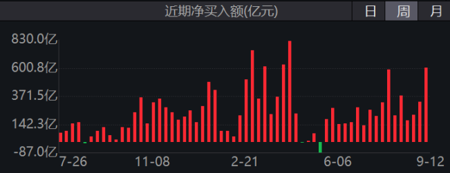 b. 南向资金继上周净流入 330.6 亿后,本周净流入约 608 亿。三季度以来南向资金买入力度回暖,净买入力度明显增强;