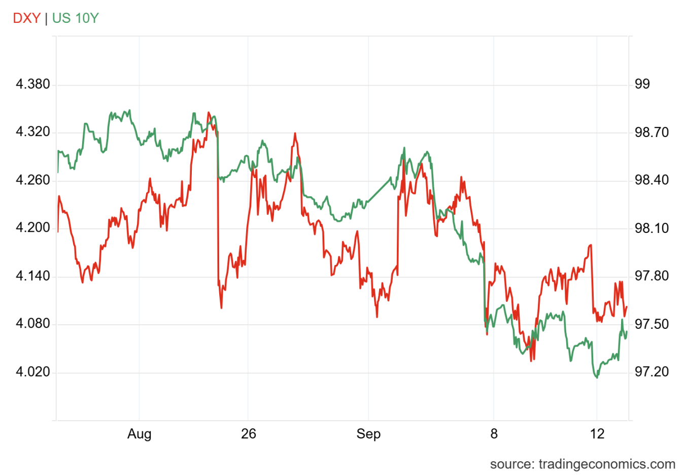 1. 美元指数(7 月以来):CPI 虽有反弹但并未大幅超预期,降息预期压制了美元的反弹。短期来看,政策宽松前景叠加就业数据疲软,美元指数仍偏弱整理。周跌 0.18% ,30 天跌 0.14%,年内跌 10.05%;