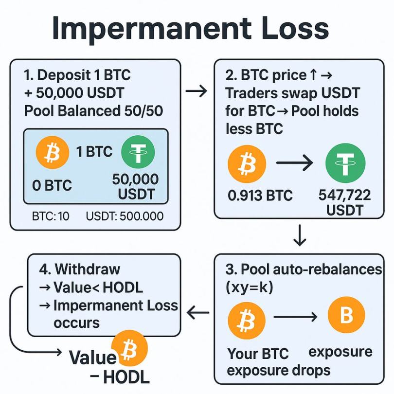 例如,在 BTC/USDT 资金池中,如果 BTC 价格上涨,交易者将向资金池出售 BTC 以获取利润,而流动性提供者最终会持有更多 USDT 和更少的 BTC。