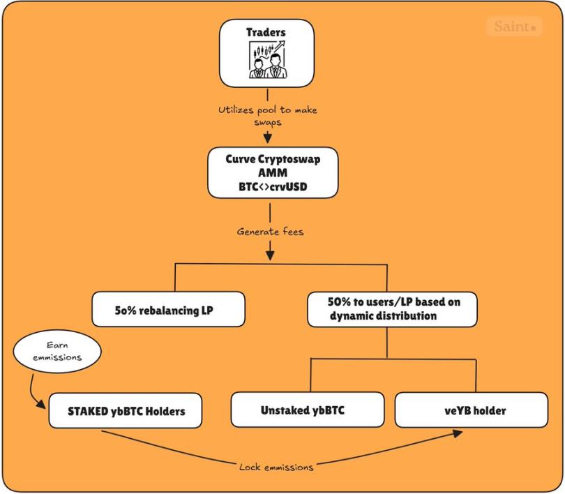 质押的 ybBTC 持有者可以锁定他们收到的排放,以同时享受作为 veYB 持有者的费用和排放,创造一个飞轮效应,使他们能够从协议中赚取最大费用,如下图所示。