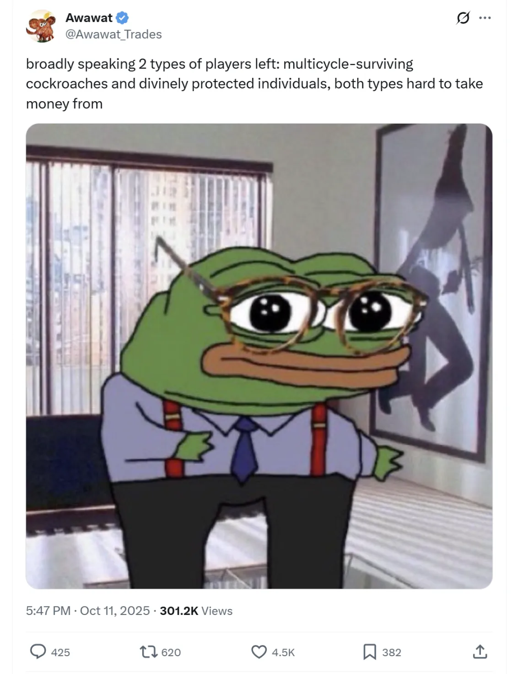 编者按:当加密货币市场经历「10.11」断崖式崩盘,山寨币平均暴跌 62% 的残酷现实下,作者以亲历者视角复盘生存逻辑:从 Delta 中性策略的意外幸免,到对杠杆使用与市场投机的深度反思。文中既揭示 DeFi 与永续合约平台的承压测试,也抛出「热爱驱动行业幸存者」的核心命题。以下是全文翻译: