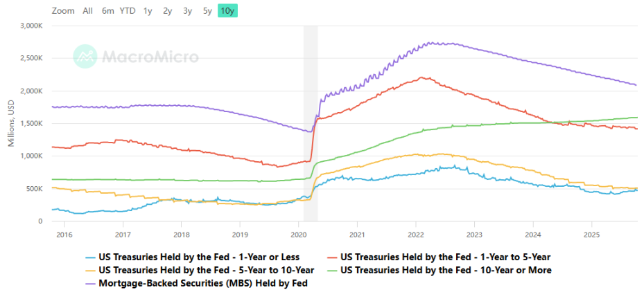 b. QT 的主要压缩来源于中短期国债与 MBS,反映出美联储在逐步回收疫情期间超额流动性;