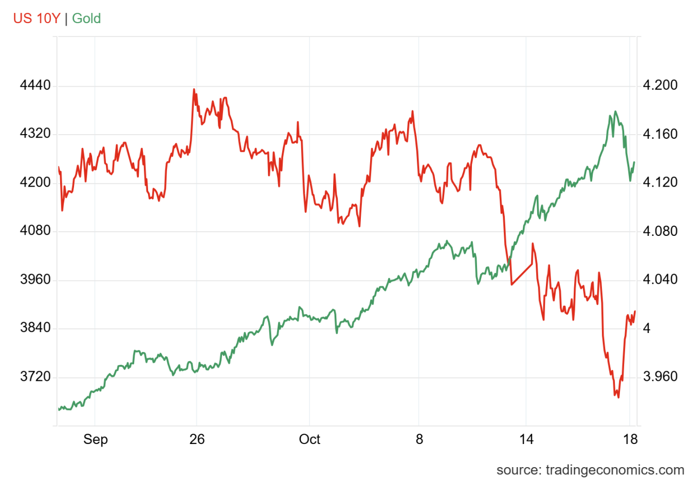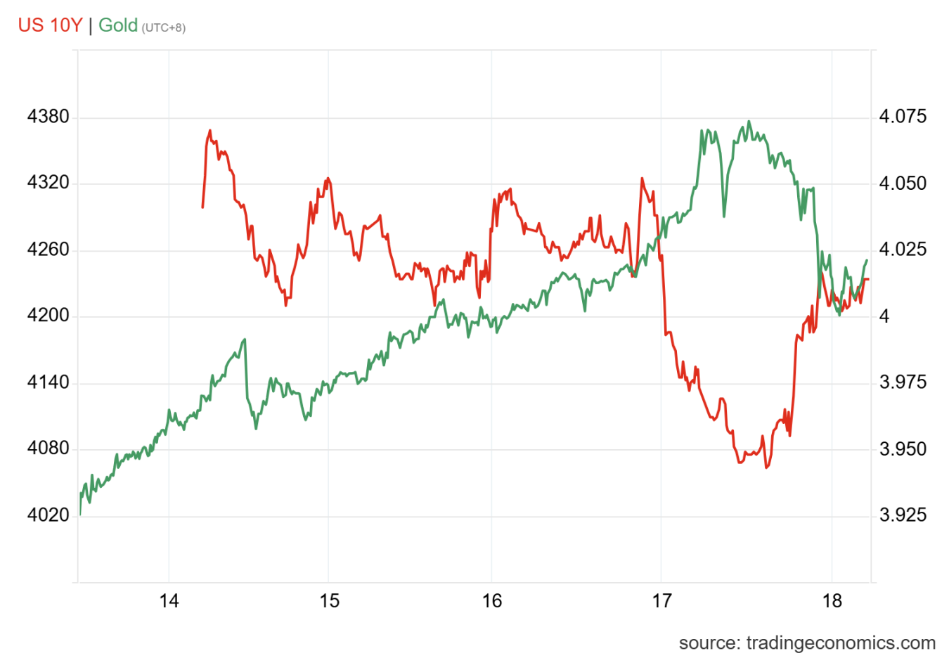 c. “美债收益率下跌 + 黄金上涨” 通常被视为市场避险情绪上升的典型信号,收益率止跌反弹,黄金略微回落,意味着部分资金开始尝试重新布局风险资产;