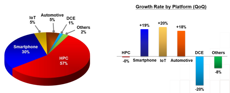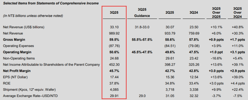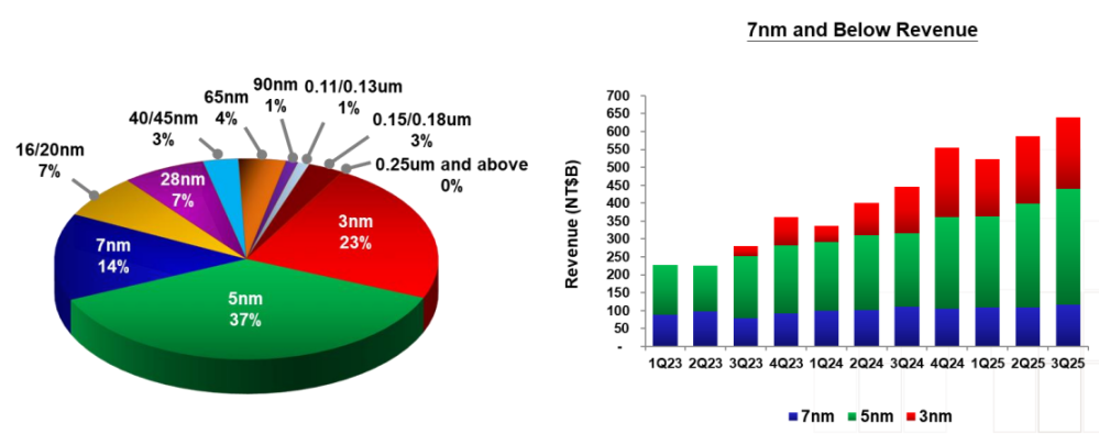 b. 台积电财报 - 先进制程(3nm/5nm 等)和 AI/HPC 相关晶圆需求占比显著,驱动毛利与营收双升;