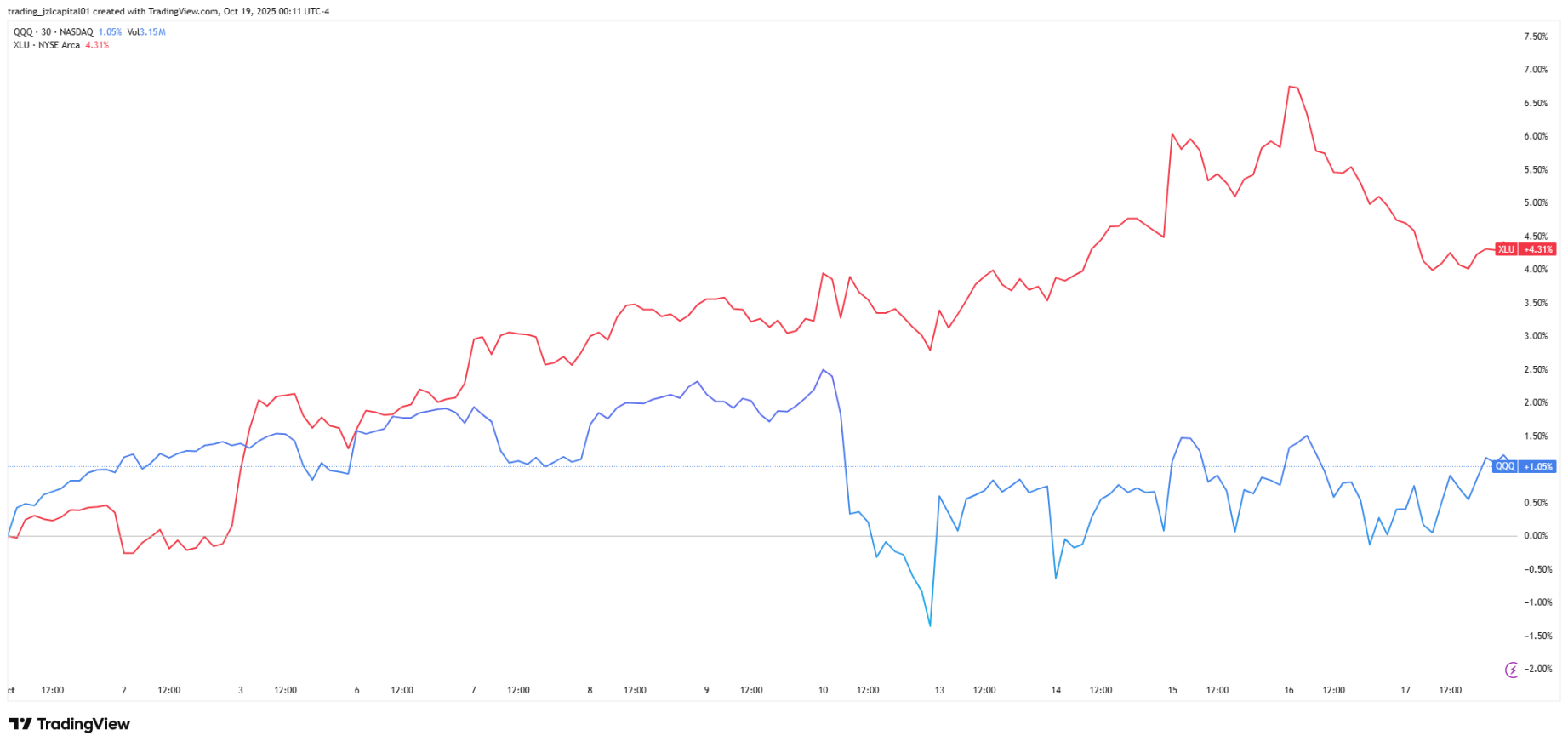 c. 风险偏好承压导致 QQQ 周内波动加剧,防御型板块龙头 XLU 逆势上涨 4%+,资金短期回流防御;