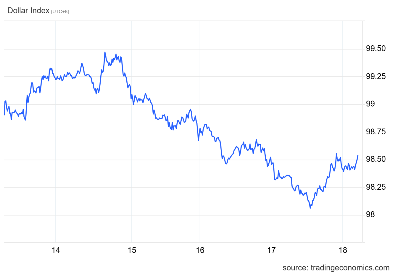 a. 鲍威尔的鸽派言论显著提振市场风险偏好,中止美元指数近期涨势。周跌 0.41% ,30 天涨 1.67%,年内跌 9.20%;