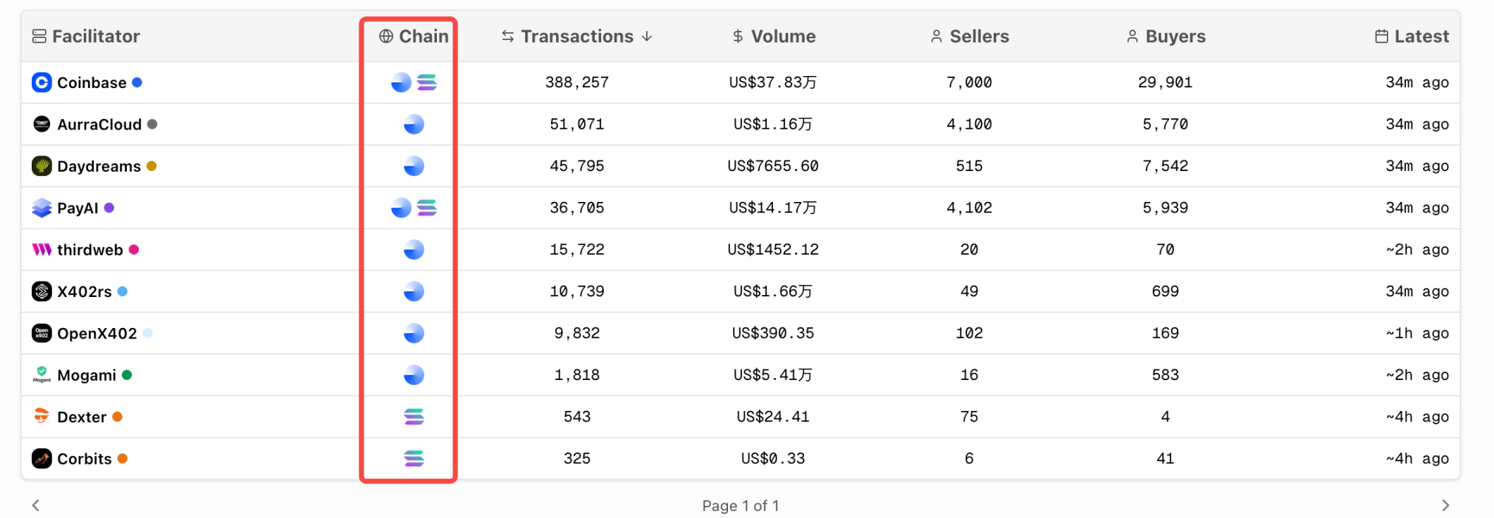 看看现在 x402 的链上数据就知道,所有的 Facilitator 几乎都在 Base 和 Solana 上。