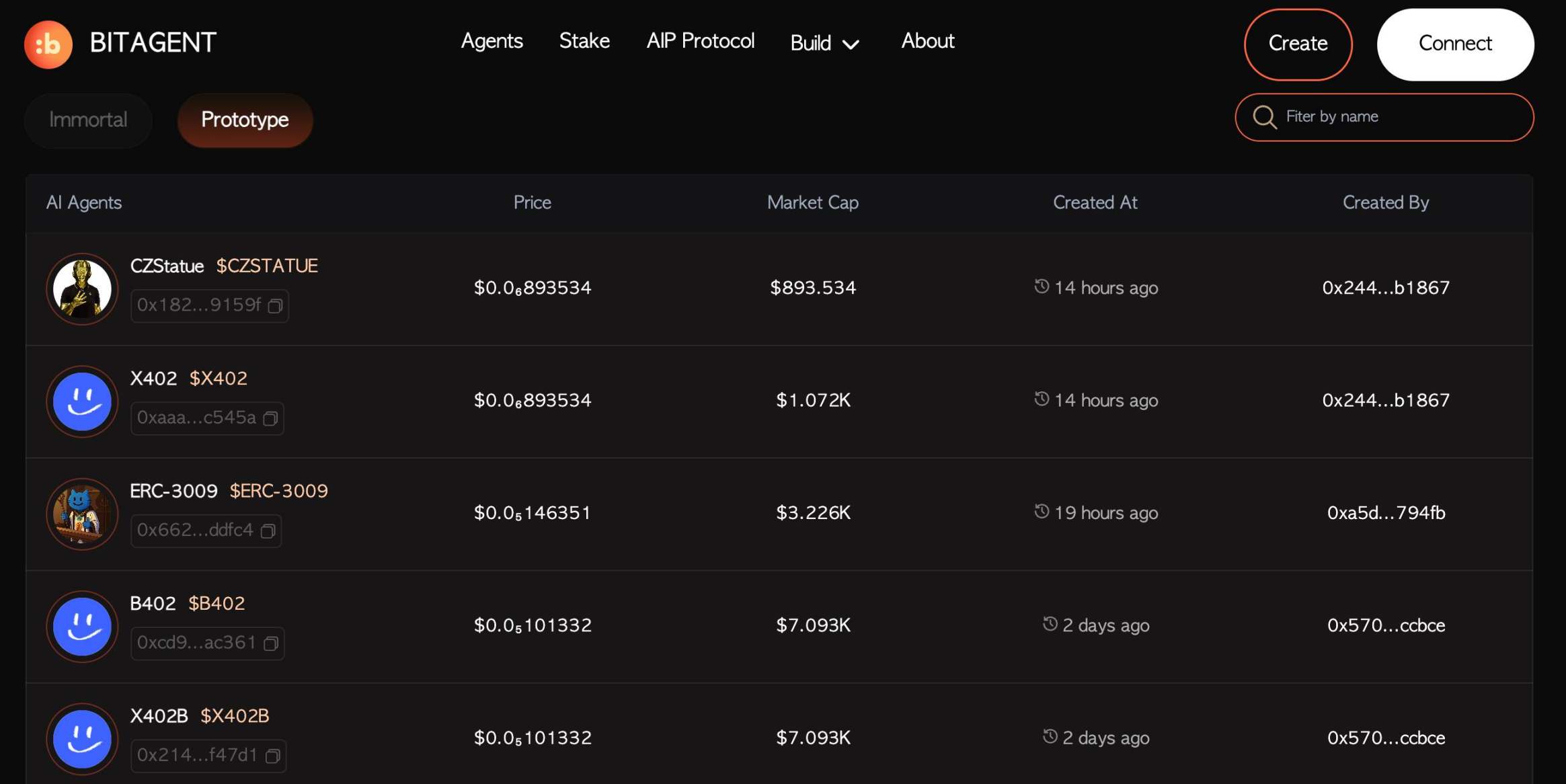 除了 Facilitator,Unibase 也关联开发了一个 BitAgent 平台,让开发者能快速发行 AI Agent,配合 Unibase Memory(记忆存储层),形成了「支付 + 发行 + 记忆」的完整生态。有点像 BSC 上复制了一个 mini 版的 Base AI 生态。