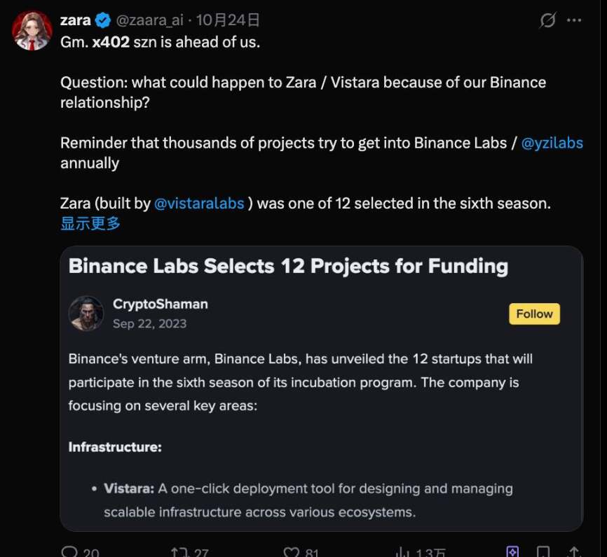 10 月 30 日其宣布参与 x402 Solana 黑客马拉松,专注实时 AI 结算,也被 CoinGecko 收录到 x402 生态系统代币 List 中。