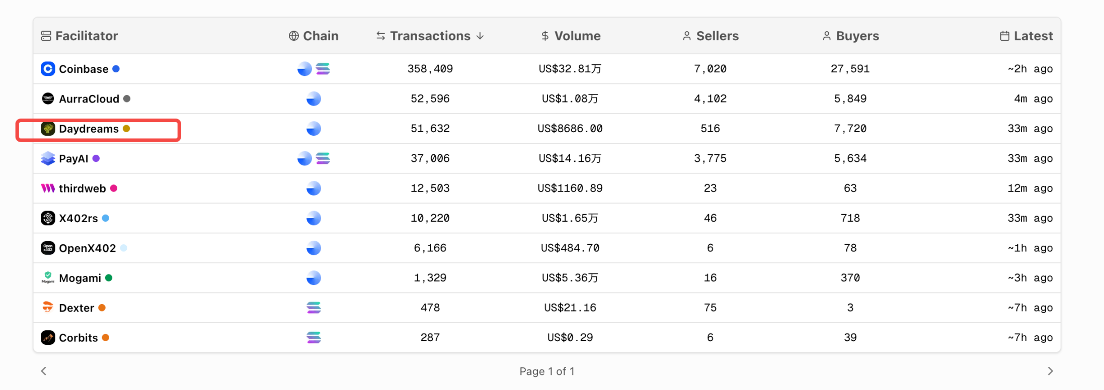 在 x402 的 Facilitator 排行榜上,当前 Daydreams 排第三,处理了超过 5 万笔交易。