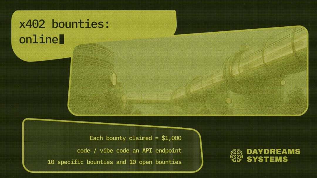 10 月 30 日,Daydreams 宣布了一个有趣的玩法:发布 20 个 1000 美元的赏金任务,总计 2 万美元。每个赏金资助一个小型 API 服务的开发,这些服务都通过 x402 收费。他们称之为「Microbusinesses that can be built in a day」,一天就能搭建的微型生意。
