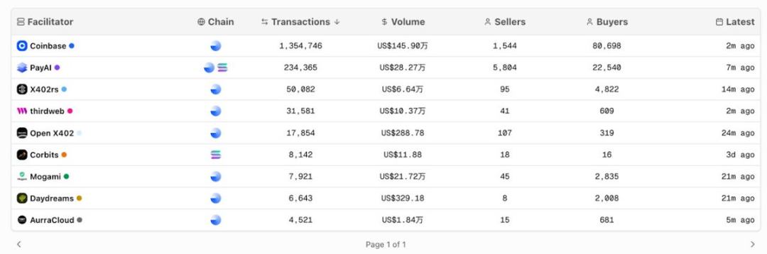 从下图数据看,Coinbase (@coinbase) 依然是最大 Facilitator,处理交易超 135 万笔,覆盖 8 万买家;PayAI (@PayAINetwork) 居次位,在 Solana 和 Base 等链上活跃,累计 28 万美元交易额,用户数甚至超过 Coinbase。其他如 X402rs、Thirdweb (@thirdweb)、Open X402 (@openx402) 等也在争夺市场份额。