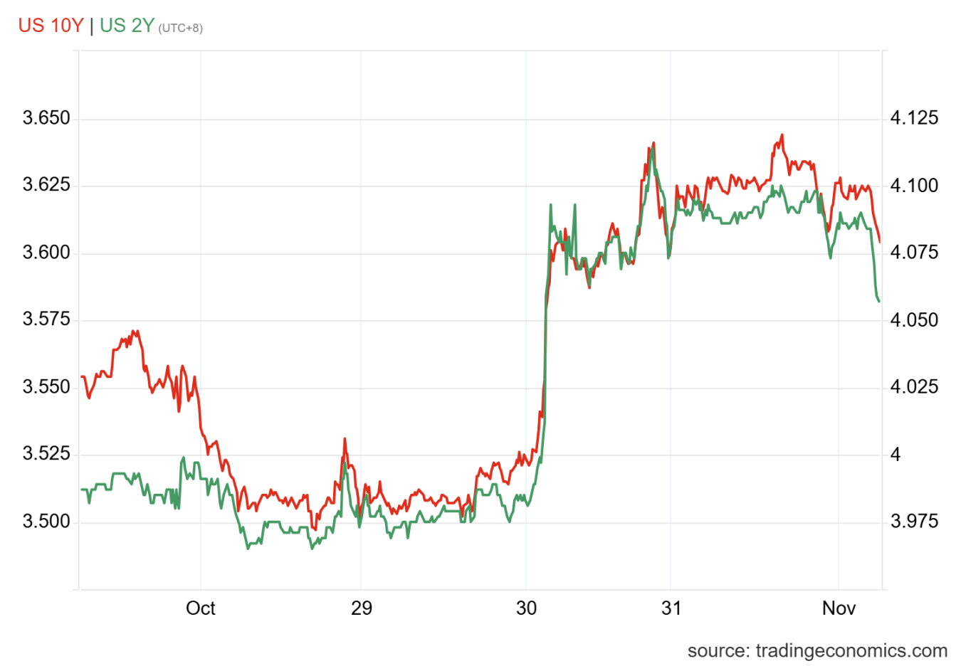 a. 鲍威尔讲话过后,2 年期美债、10 年期美债遭遇抛售令收益率直线拉升,目前不存在利率倒挂情况;