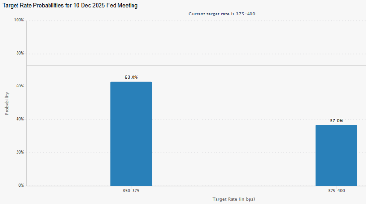 a. 根据 CME FedWatch,12 月降息 25 个基点的概率从一周前的 91.7% 大幅回落至 63%;
