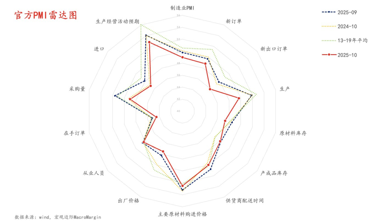 a. 10 月份制造业 PMI 为 49.0%,低于前值的 49.8%,连续 7 个月处于收缩区间。PMI 从年初高位回落并跌破 50,反映制造业需求端显著回落且动力不足,需警惕制造业带动的就业与投资进一步下滑;