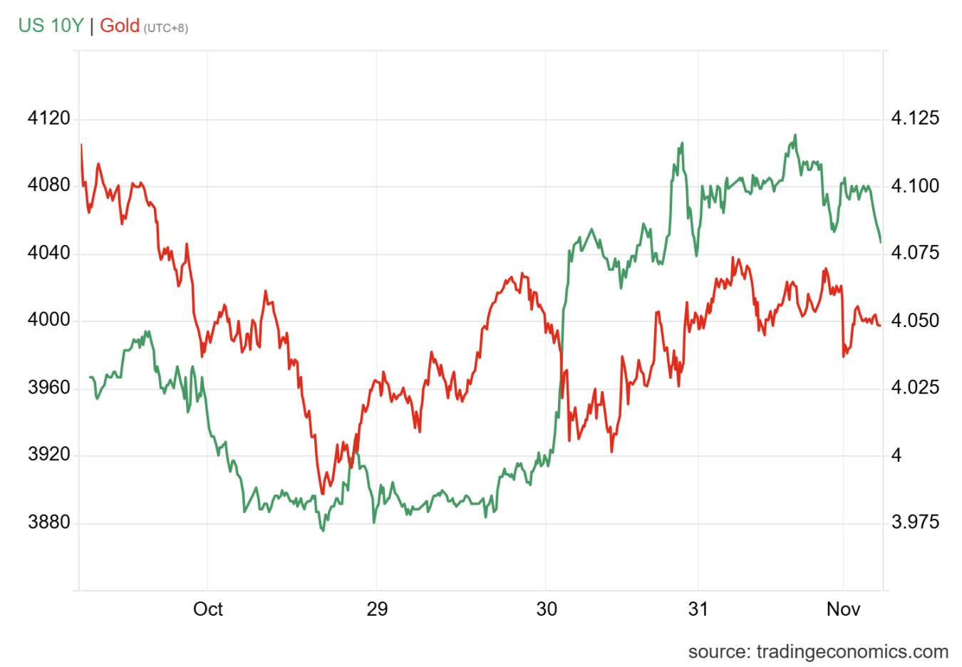 a. 中美贸易战降温 + “偏鹰”降息预期拖累金价表现并遭遇连续 2 周下跌。周跌 2.03% ,30 天涨 3.58%,年内涨 52.48%;