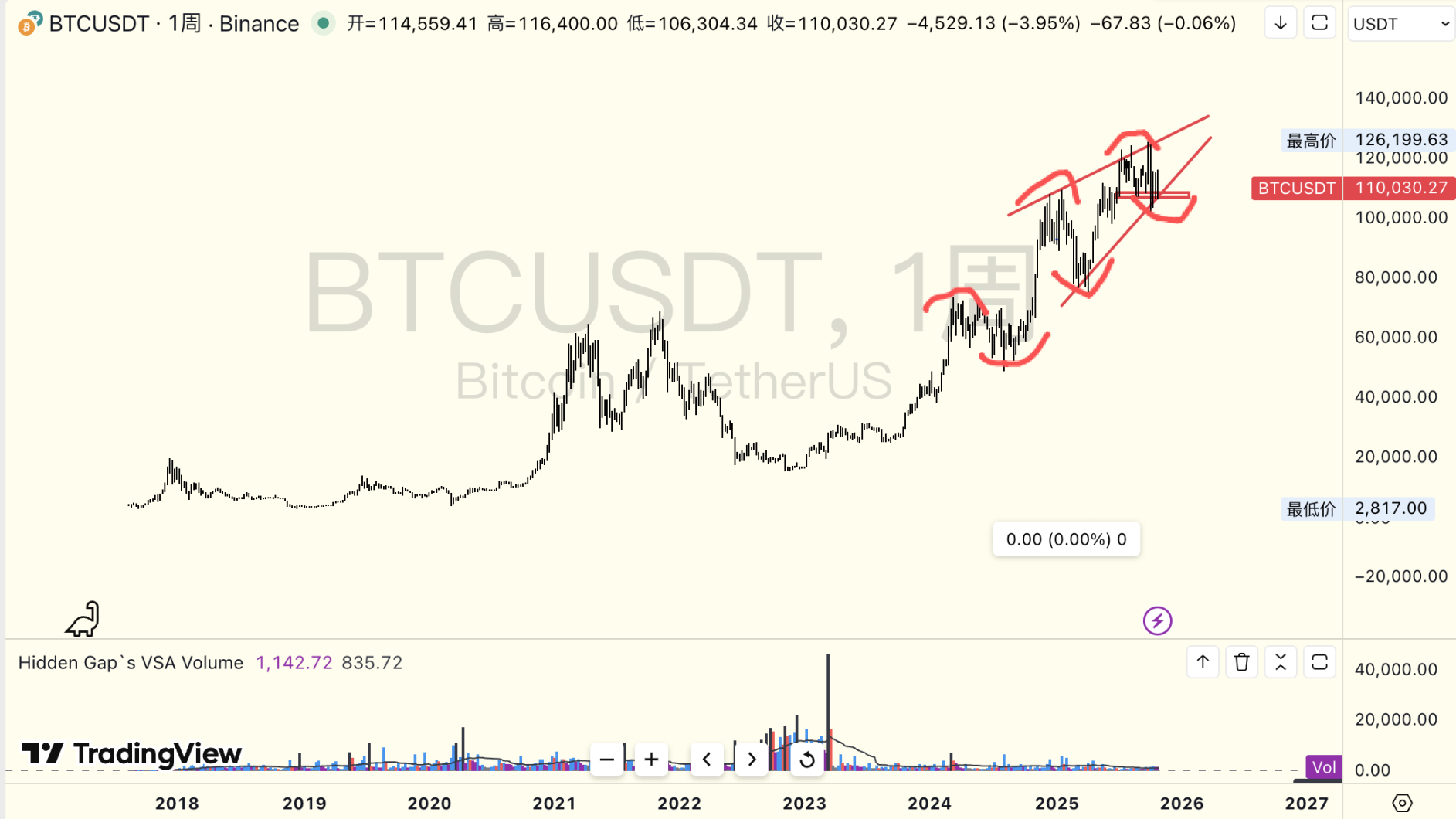 a. 上周对市场预判市场会小幅稳步上涨,但实际情况市场在上周波动不小,周一 BTC 最高来到 116000 附近后受议息会议鹰派言论的表述最低回落至 106000,周内振幅达到 8.5%,当前处在一个周线级别的关键变盘阶段,价格结构可以被理解为一个 矩形整理区间 或 楔形结构。如果从楔形角度来看,当前走势正处在楔形的末端边界位置,意味着方向即将选择,如果周线级别的实体部分出现下破,则可能形成“假突破”或者“下破后反抽再下破”的形态,而这往往意味着该区域下方有较强的支撑,从趋势角度来说,如果低点不断抬高、高点也不断抬高,那么整体走势仍然倾向于中继结构,而非反转。当前市场在 116000 到 106000 之间都形成了支撑、压力位,预计本周仍然会在这个区间内震荡;