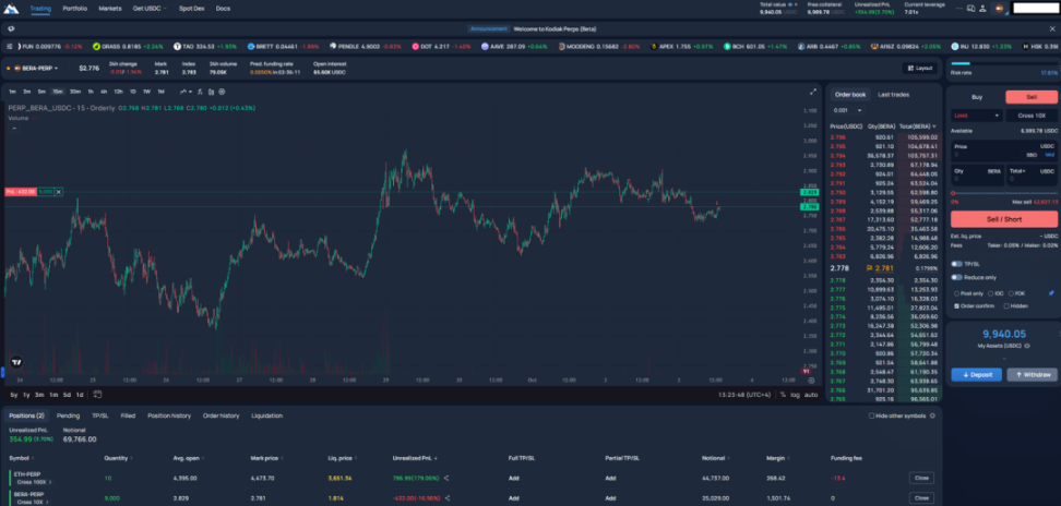 作为 Berachain 原生的永续合约平台,Kodiak Perps 正逐步成为这一生态的核心流动性引擎。上线三周内,平台交易量已突破 1 亿美元,通过 100 倍杠杆产品 与 多链 USDC 跨链结算支持,显著提升了资金利用率与市场活跃度。依托与现货 DEX 的无缝衔接,Kodiak Perps 构建起贯通 现货—衍生品 的流动性通道,使资金在不同交易场景间高效循环。