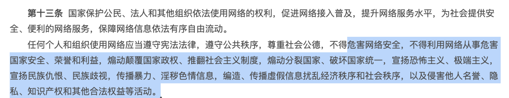 这里需要讨论的关键问题,不是是否使用了 VPN,任何人都没有权力说只要使用了 VPN 就违法。问题的关键在于使用 VPN 后做了什么。假如是去用谷歌搜索学术论文、使用 ins 去追星等等,懂法的警察叔叔肯定不会说你违法;但是假如使用 VPN 去进行以下行为,那就另当别论了(摘自《网络安全法》)。
