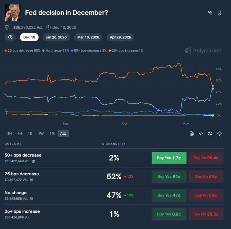 美联储官员集体放鹰,市场动荡的核心驱动力源于利率路径的重估。过去一周内,美联储官员相继发表偏谨慎的言论,令市场对 12 月降息的预期迅速降温。Polymarket 官网数据显示,市场押注今年 12 月美联储降息 25 基点的概率为 52%,「不降不加」的概率上升至 47%。目前该预测市场成交额超 8800 万美元。