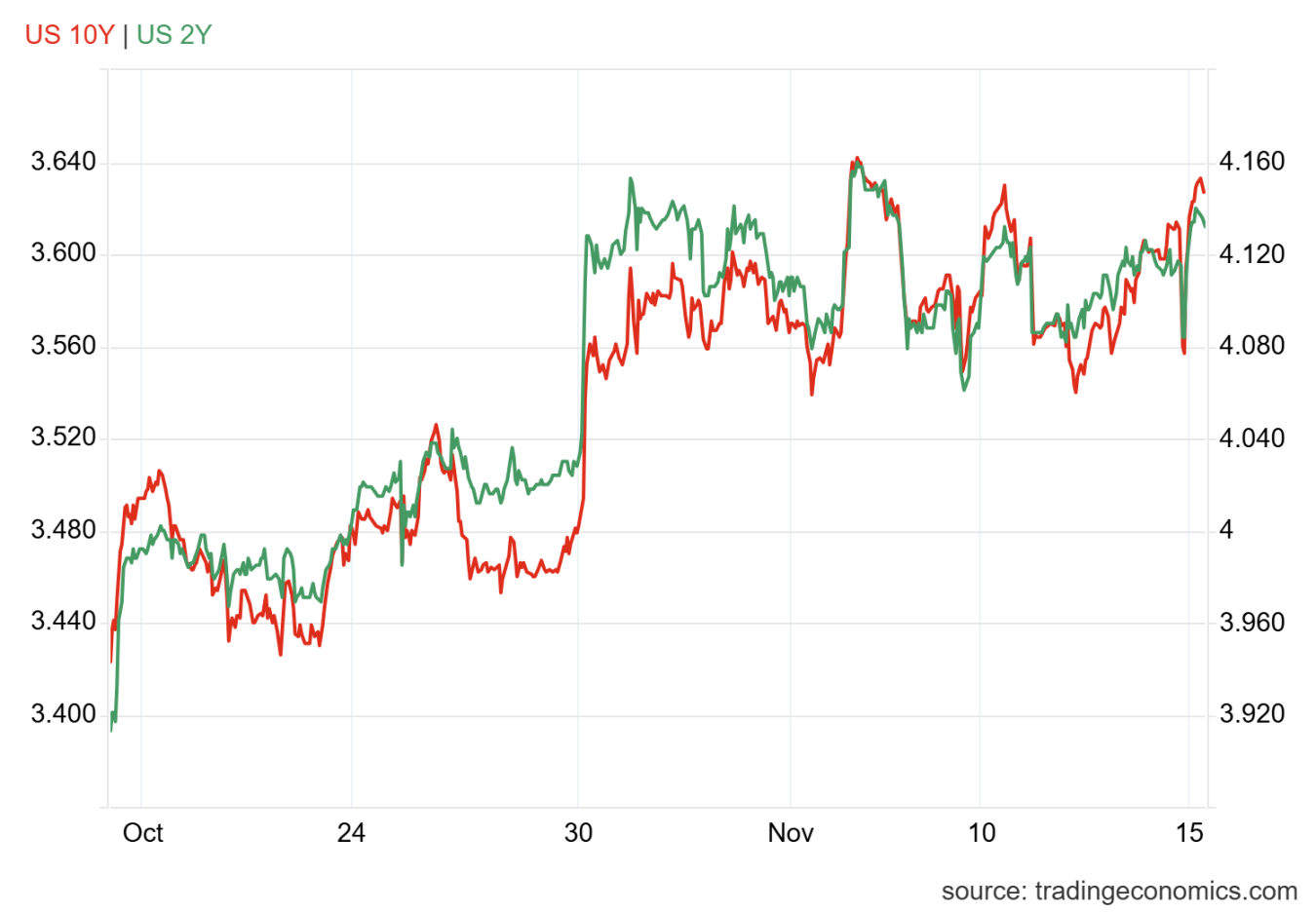 a. 与利率预期关联密切的 2 年期国债(高利率预期 + 抗通胀压力加强)上升 2.7 个基点至 3.62%,基准 10 年期美债(长期通胀 + 财政赤字)涨 3.9 个基点至 4.15%;