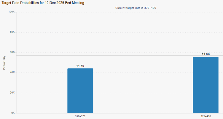 a. FedWatch 数据,12 月降息 25 个基点的概率从前周的 66.3% 降至 44.4% 以下;
