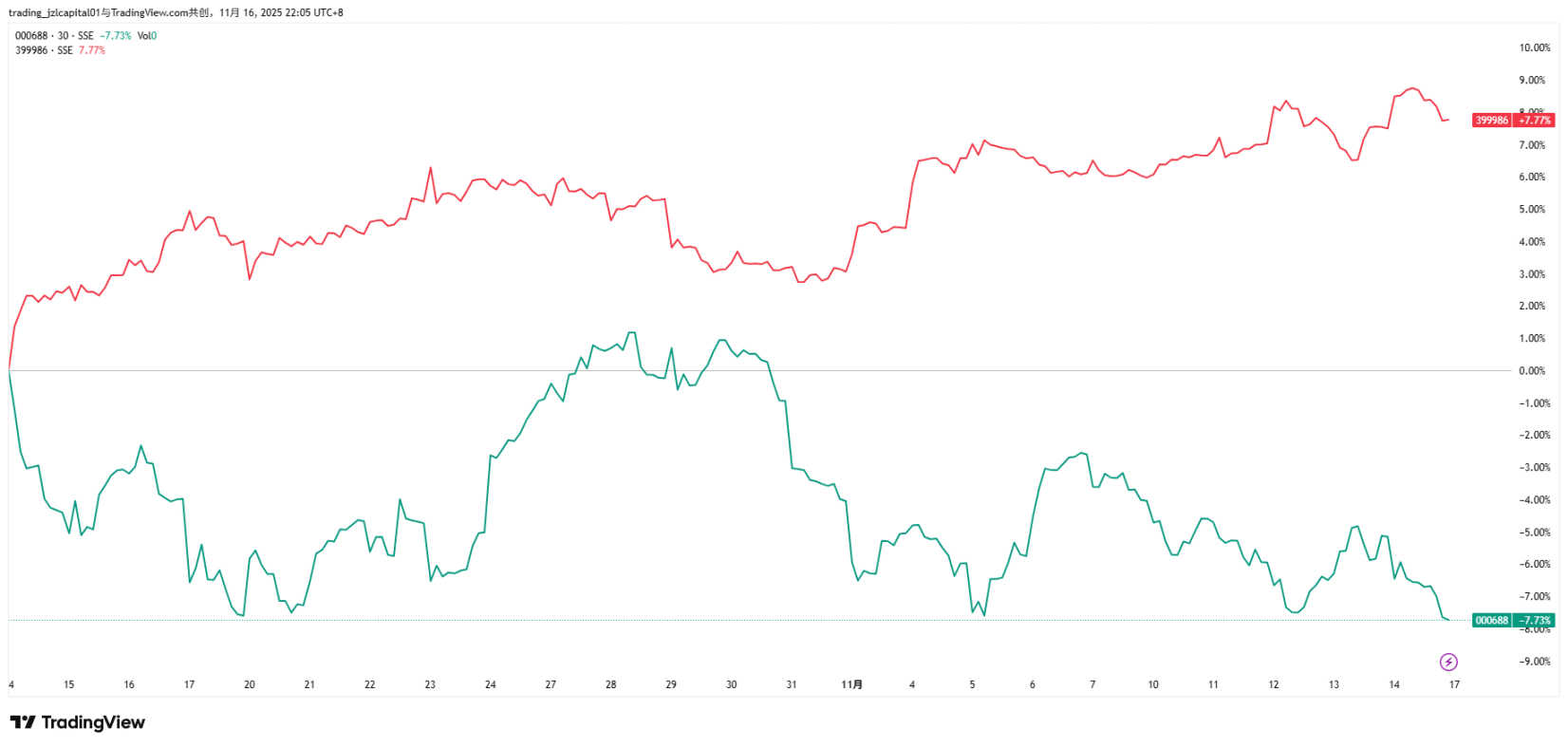 b. 最近一个月,A 股防御板块(中证银行指数)表现亮眼,成长板块(科创 50)持续调整,资金风险偏好下降,从追求超额收益转向锁定利润;