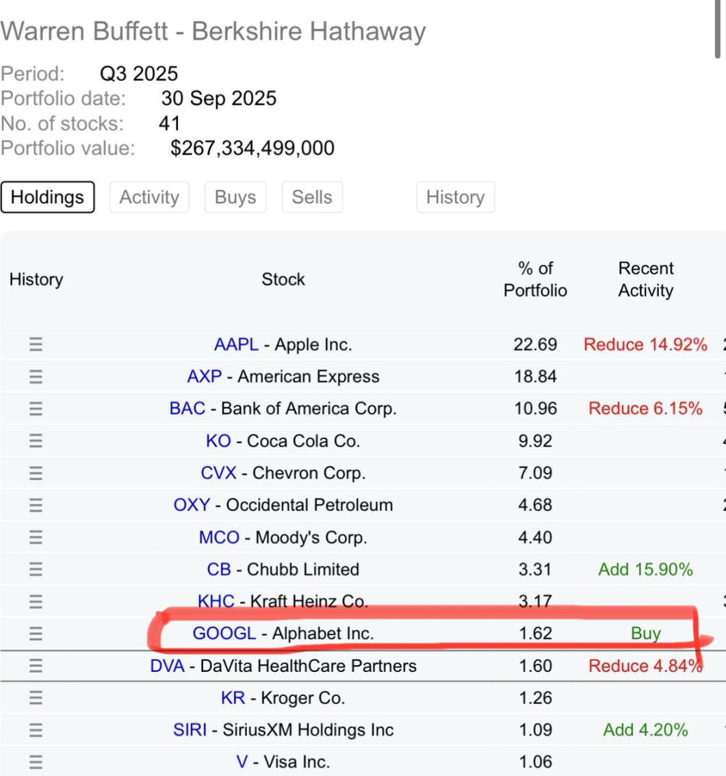 ii. 买入确定性高、护城河强、现金流稳定且在合理价格的公司,然后长期持有。其中,伯克希尔哈撒韦新近加仓的 Googl 在 2025 年 Q3 收获了 42% 的增长表现;