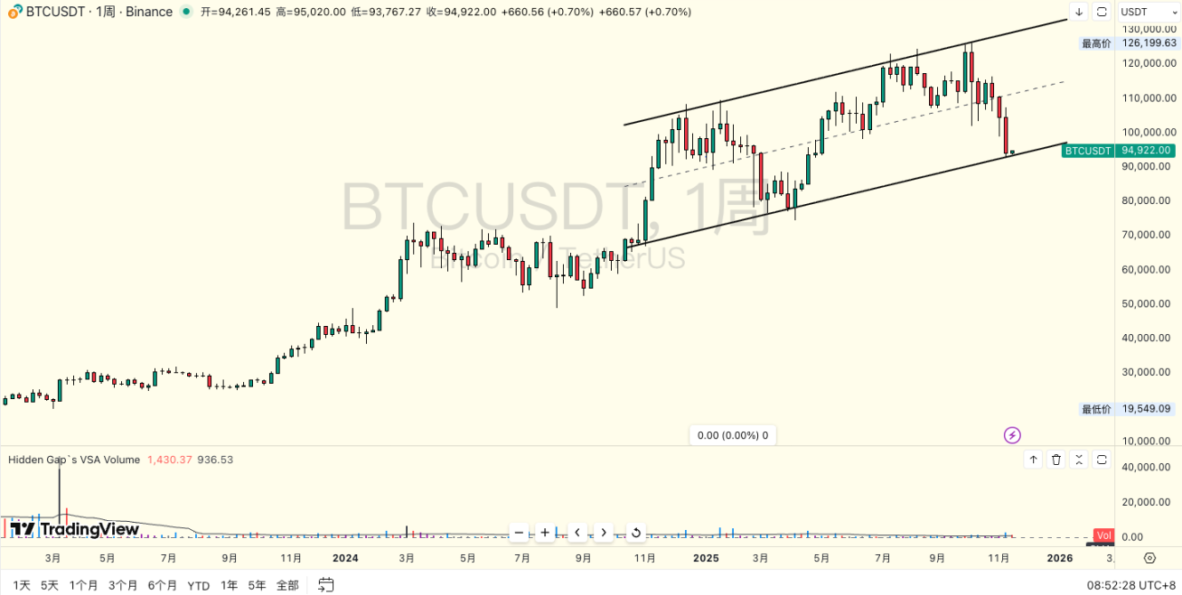 a. 上周对市场预判会以震荡为主,实际 BTC 在周内有接近 10% 的跌幅,从周线来看市场当前已来到一个重要的通道下轨的位置,因此本周的币价将决定市场未来会走反弹还是会转熊,本周 FOMC 将公布停摆后首份非农报告以及后续数据的释出,对 12 月份的降息决定会有较强执导,当前市场我更偏向于避险,而加密货币由于收到 1011 的双重打击,导致市场以及机构无力招架,本次下跌也有多家做市商损失惨重,因此这是一个多方作用的结果,如果市场转熊,预计也会是短熊,参考一月份 3 个月的整理时间,未来市场至少还有一次破高的机会;