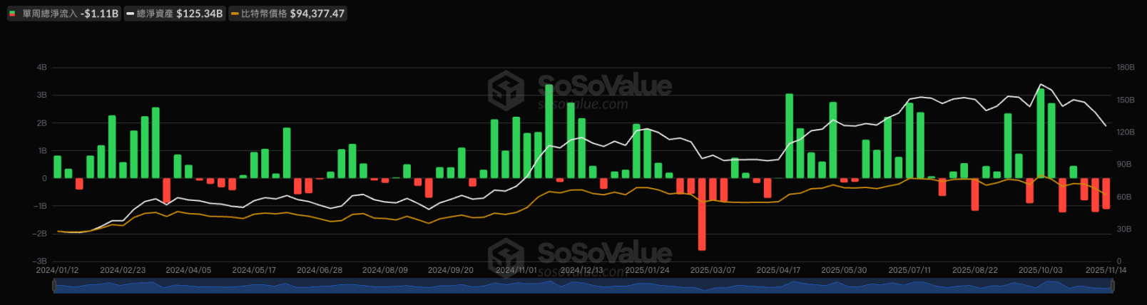 a. 上周市场跳水,ETF 继续出逃 11.1 亿美元,最近一个多月已经连续流出接近 40 亿美元,是市场下跌的主要动力之一,当前市场偏向避险,因此加密资产成为首先被抛售的对象,当前 ETF 总市值在 1250 亿美元,其中 IBIT 总流入为 637 亿美元。