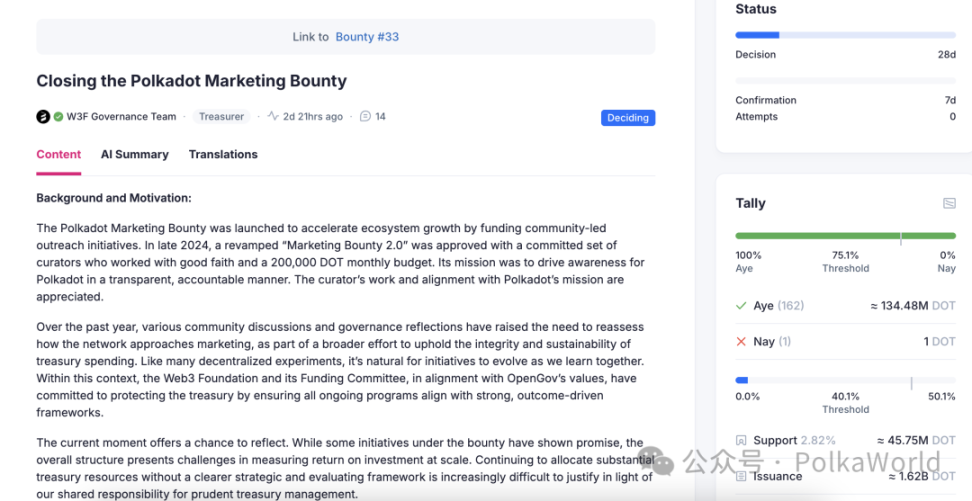 在过去一年中,Marketing Bounty 虽推动了部分社区营销尝试,但 “高额消耗 + 效果难量化” 的结构性问题不断引发讨论。W3F 指出,在 OpenGov 时代,国库支出必须更透明、可衡量、以成果为导向,因此继续维持该赏金已难以合理化。