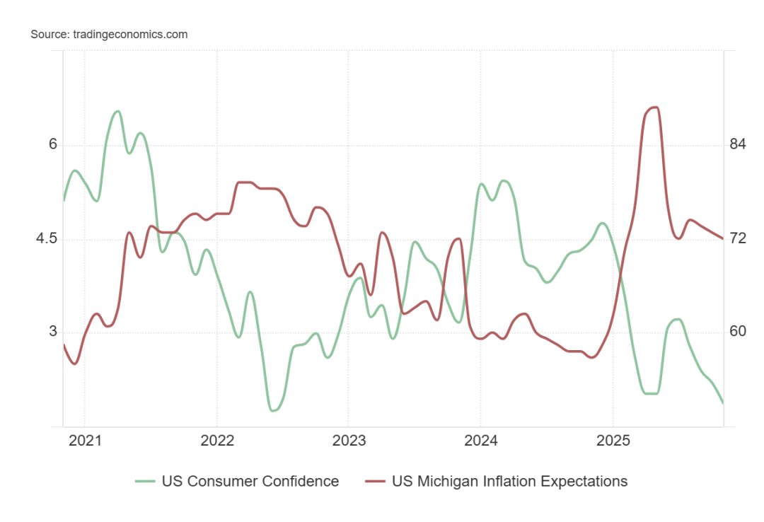 a. 11 月密歇根消费者信心指数终值从 10 月的 53.6 大幅下降至 51.0,为 2022 年 6 月以来最低水平。1 年通胀预期终值 4.5%,低于初值的 4.7% 以及前值的 4.6%,连续第三个月放缓;