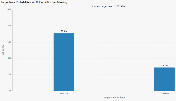 a. FedWatch 数据,12 月降息 25 个基点的概率从前周的 39.1% 上升至 71%,降息概率大幅提升;