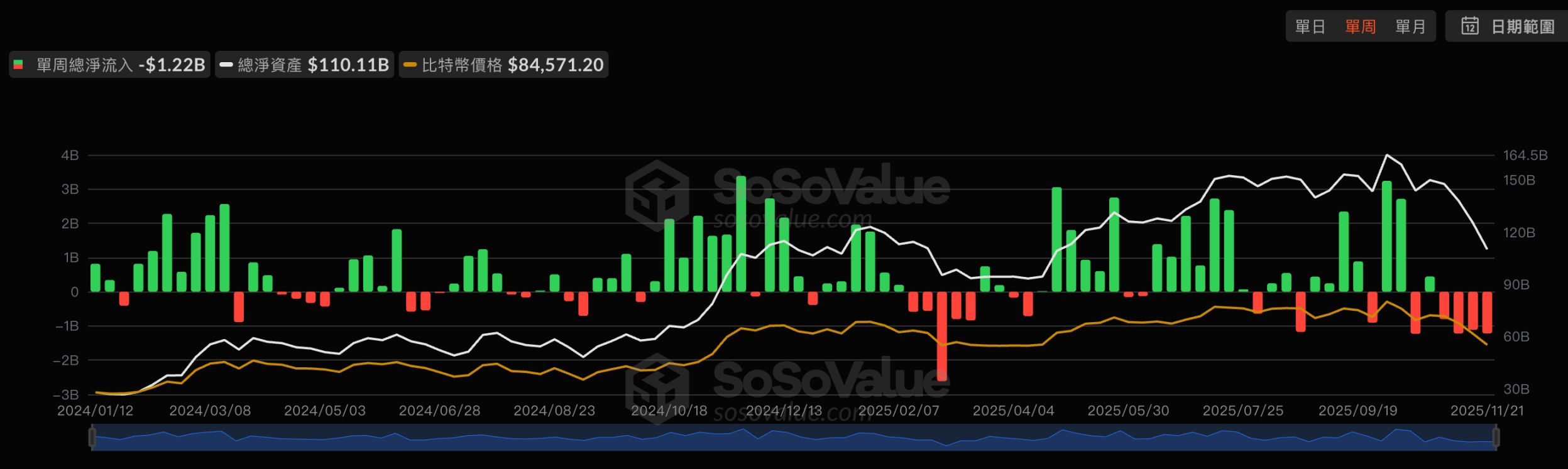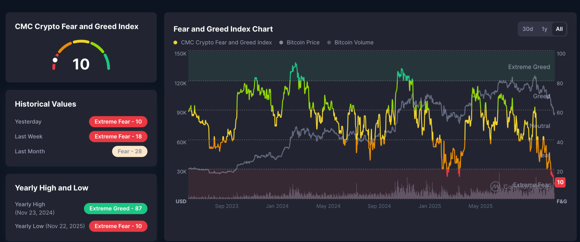 a. 恐慌指数在本周跌至 10 的极度恐慌区间,这也是自 2023 年以来的最低点,市场的极度恐慌短期存在情绪与技术驱动的反弹可能,但行情的中期压力依旧来自更深层的结构:ETF 流出、美联储政策不确定性、以及机构在亏损条件下的持续再平衡。