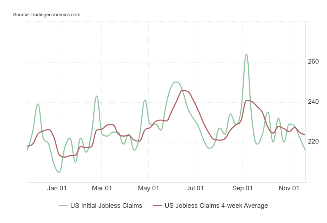 a. 截至 11 月 22 日当周,初请失业金人数为 21.6 万,低于预期得 22.5 万记前值 22.2 万,连续第三周下降,触及 2 月以来的最低水平;