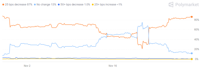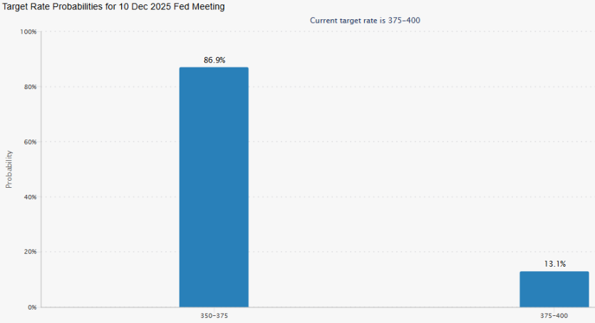 a. FedWatch 数据,12 月降息 25 个基点的概率从前周的 71% 上升至 86%,降息概率大幅提升,这一预期如果兑现,将为市场提供流动性支撑;