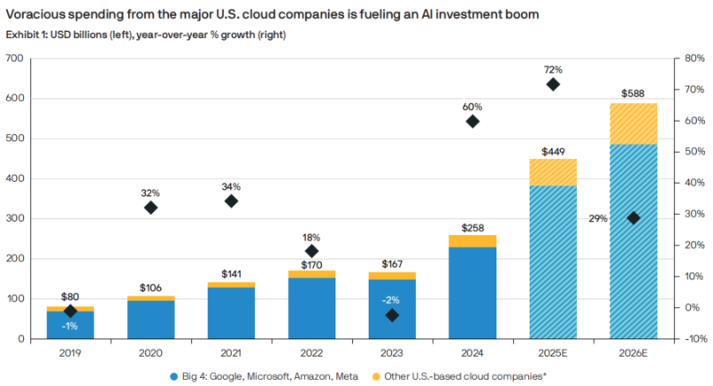4. AI 周期可持续性: “Unlike past episodes of speculative excess, today’s AI cycle is being largely financed by profitable, cash-rich firms and underpinned by robust demand. The tech sector’s free cash flow margin, near 20%, is more than double its late 1990s level, underscoring both robust profitability and the capacity to self-fund AI investment. AI spending is also translating into monetized demand for AI hardware, cloud services and software, helping justify continued investment.” / “与过去的过度投机时期不同,今天的 AI 周期主要由盈利丰厚、现金充裕的公司资助,并由强劲的需求支撑。科技行业的自由现金流利润率接近 20%,是 1990 年代末水平的两倍多,突显了强劲的盈利能力和 AI 投资的自筹资金能力。AI 支出也正在转化为对 AI 硬件、云服务和软件的变现需求,有助于证明持续投资的合理性。”