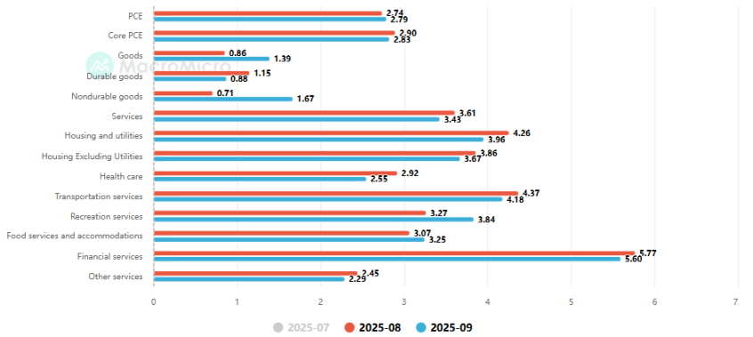 b. 非耐用品在 9 月出现较明显的上升,显示消费品通胀近期压力在回升。相反,权重占比较高的 housing including utilities (15~18%), health care (15~18%) 在 9 月出现明显下降助力服务业通胀数据向好;