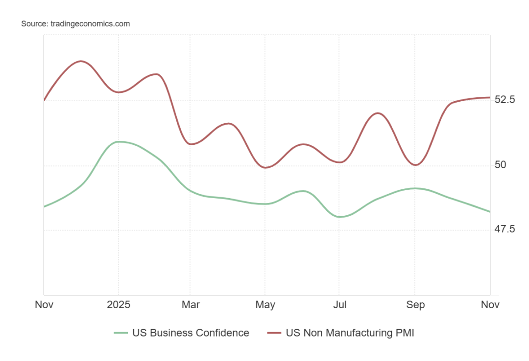 a. 11 月 ISM 制造业 PMI 为 48.2,不及市场预期的 49 以及前值的 48.7,连续第 9 个月低于 50 的荣枯线。而 11 月 ISM 服务业 PMI 为 52.6,高于预期的 52,创下最近 9 个月以来的新高;