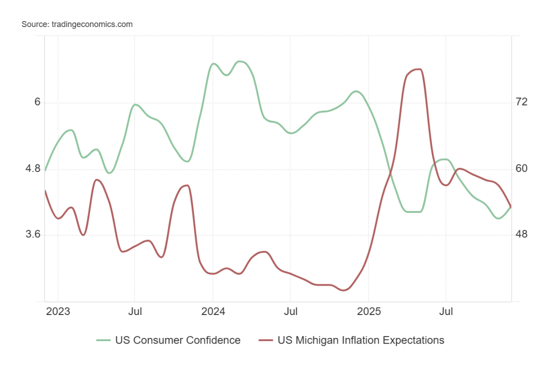 a. 密歇根大学消费者信心指数在 12 月回升至 53.3,高于市场预期的 52 及前值的 51,五个月来的首次改善。未来一年通胀预期从 4.5% 降至 4.1%,为今年 1 月以来最低;