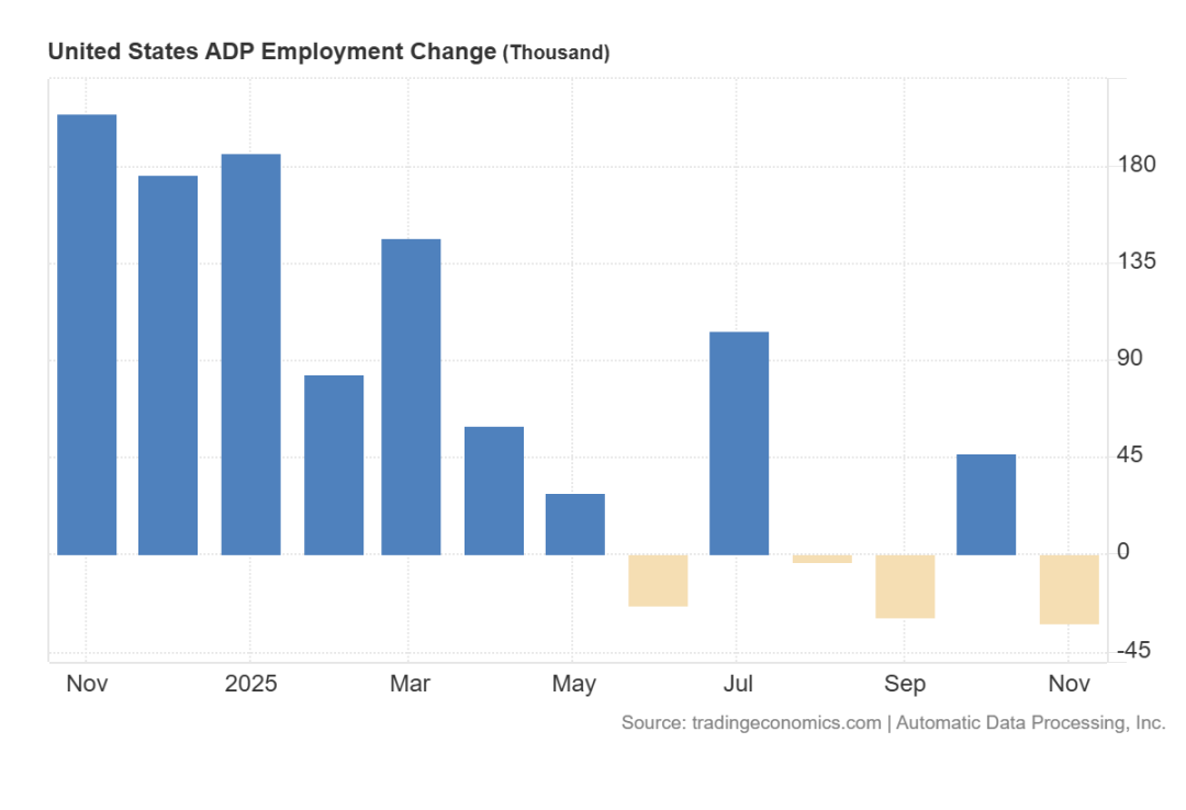 a. 11 月 ADP 就业人数减少 3.2 万,大幅低于预期的 1 万及上修后的前值 4.7 万,这是自 2023 年 3 月以来最大规模的就业下降,企业在面对不确定的宏观经济环境时保持谨慎。在通胀温和回落的情况下,就业数据的权重进一步上升;
