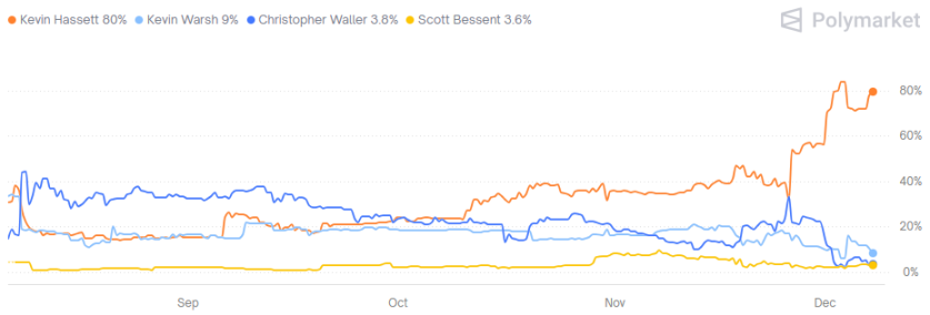a. Polymarket 数据,市场对于哈塞特胜选概率的押注明显抬升;