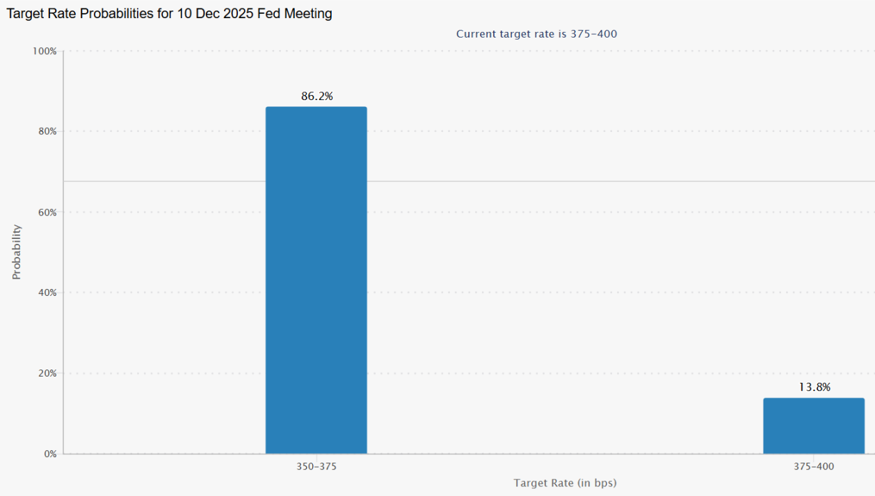 a. FedWatch 数据,12 月降息 25 个基点的概率维持在 85% 以上;