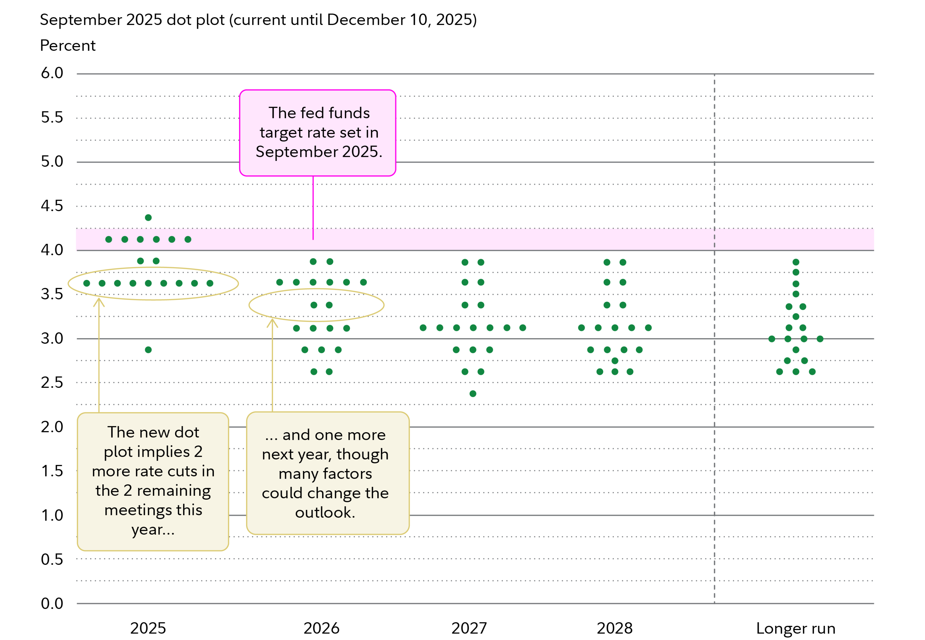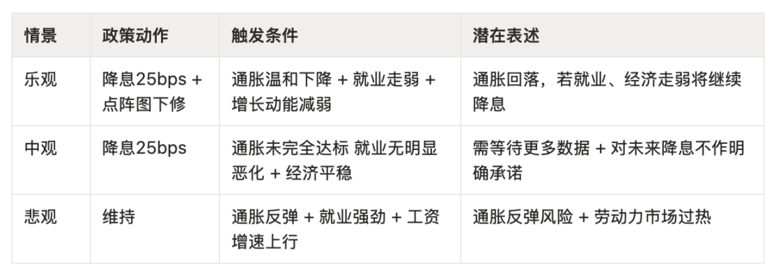 b. 根据 2025 年 9 月 FOMC 会议更新的点阵图,2025 年末预期利率中枢落在 3.50% - 3.75%,满足 12 月再降息 25 个基点,2026 年预期利率中枢在 3.25% - 3.50%,预期 2026 全年只有降息 25 个基点;