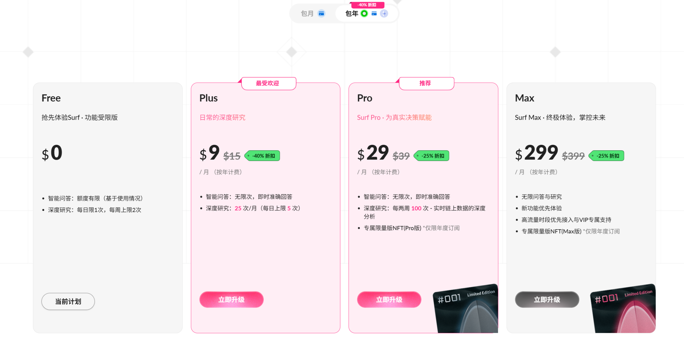 Surf 与通用大模型一样采取付费订阅制,免费用户可使用 Ask 和 Research,但配额有限。付费会员使用限额更高,并享有专属支持。